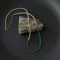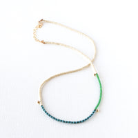 Hand-strung with Delica glass beads on silk cord, this necklace features bold color-block patterns accented with 14k gold-filled ball charms. The gold beads add a touch of movement and joy—a reminder to embrace playfulness in everyday life.