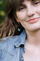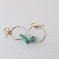 These delicate hand-formed hoops featuring an irregular turquoise chip, represents the raw natural of beauty in us all. Turquoise is possibly the oldest and most sacred of all stones, it has a strong healing vibration that instills inner calm.
