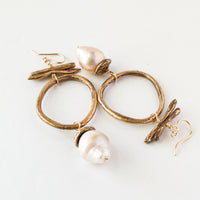 • Hand-formed bronze hoops combined with bars and acorn caps with baroque pearls measures 3"L from ear wire.