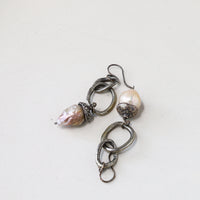 - Sterling silver hand-formed organic hoops with hand-cast acorn charm featuring irregular baroque pearl hangs 2"L.