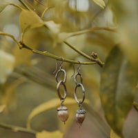 Hand-formed organic hoops with hand molded and cast acorn charms. The acorn represents patience and achievement. A mature oak can produce more than 2000 acorns a year but only one in 10,000 acorns will grow to become an oak. This speaks to the perseverance it takes to achieve our goals.