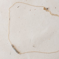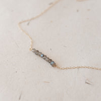 Gemstone roundel cut stones, hand-wire on delicate chain.  The delicate gemstone roundels are hand-wired into a straight line symbolizing the dash between our birth and death.  Reminding us to not let our everyday worries and thoughts take up too much of our attention.