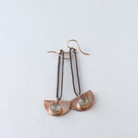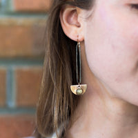 These elegant mixed-metal earrings feature elongated patinated hoops adorned with 14K gold-filled half-circle charms and rutilated quartz pendants. Effortlessly stylish and versatile, they complement any look while serving as a gentle reminder of the simple, timeless beauty found in nature.
