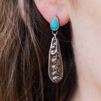 These earrings feature vibrant turquoise stones set in sterling silver bezels, each one individual and from the earth. Hand-cast sterling silver wildflower charms dangle delicately beneath, symbolizing the freedom and strength of wildflowers to bloom wherever they’re planted—just as we find our own way in life.