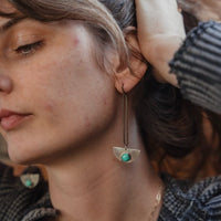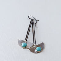 These captivating earrings feature patinated sterling silver elongated hoops adorned with crescent-shaped turquoise pendants. Their effortless movement adds a playful and dreamy touch, perfect for embracing your free spirit and dancing in the moonlight.